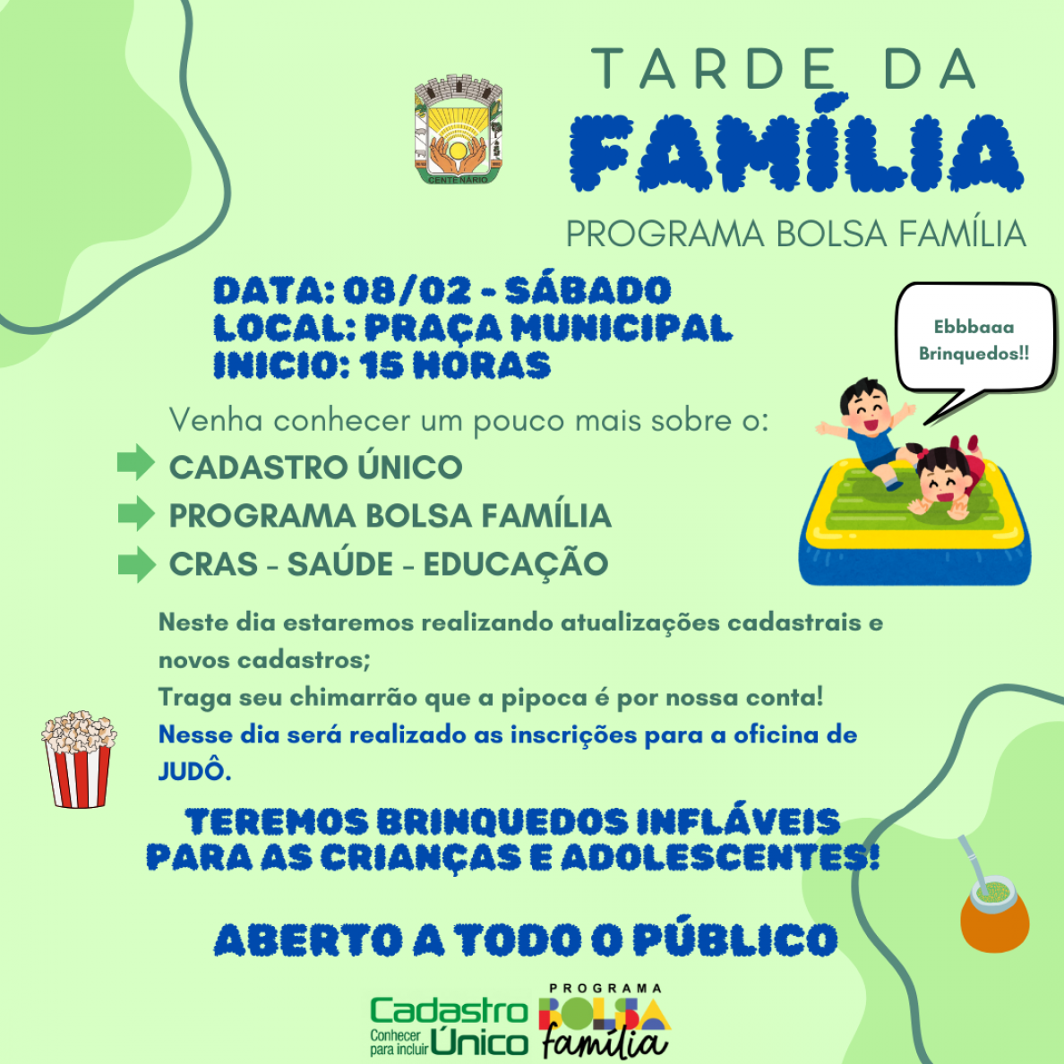 No dia 08 de fevereiro a partir das 15 horas esperamos toda a comunidade de Centenário para uma tarde divertida na praça municipal, vai ter brinquedos infláveis para as crianças e adolescentes, pipoca e água quente para o seu chimarrão. Será uma tarde para comunidade conhecer o Programa Bolsa Família e o Cadastro Único. Neste dia as famílias que já estão no programa poderão retirar as novas carteirinhas de acompanhamento, fazer a pesagem e obter informações sobre as condicionalidades do programa.