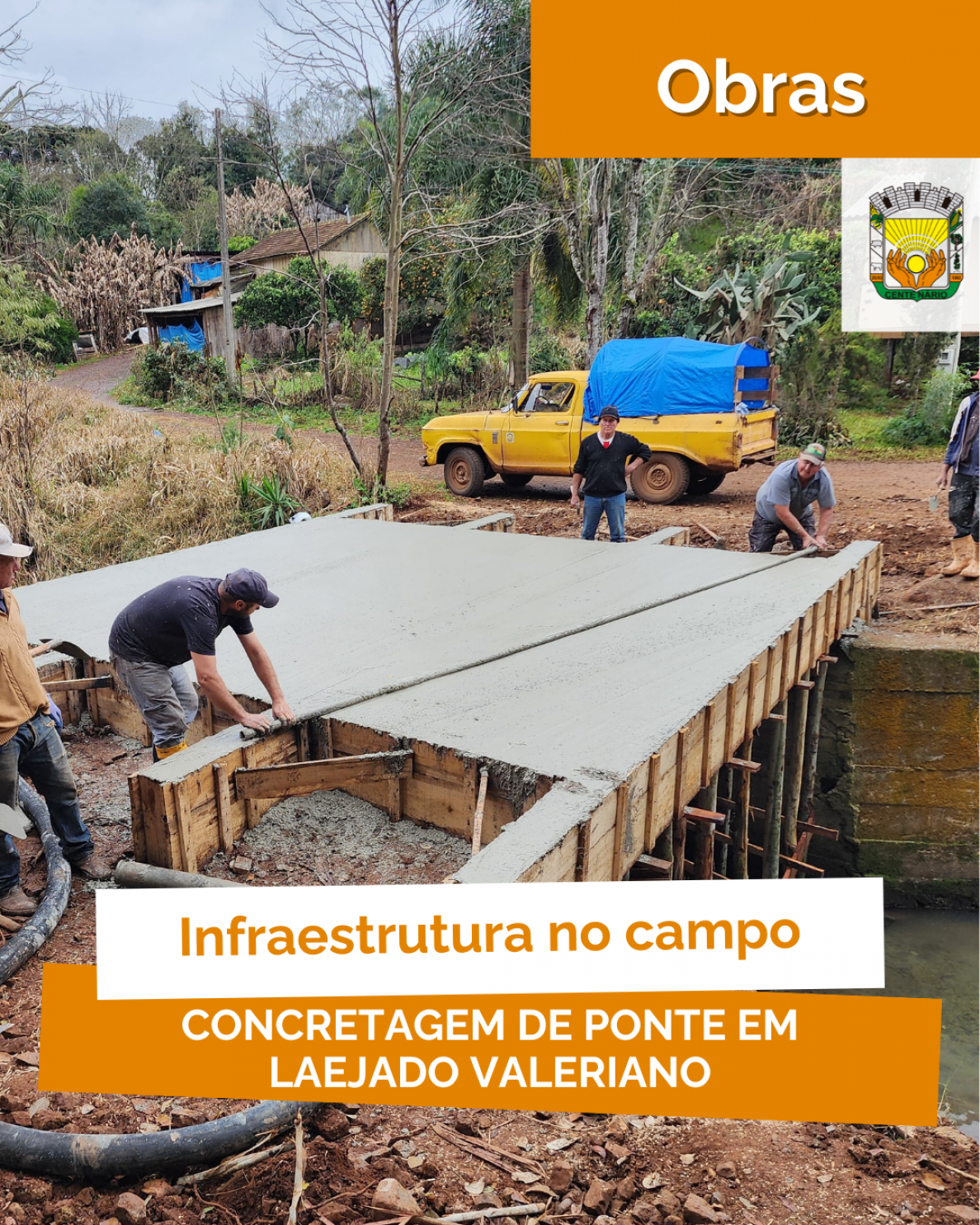 A Administração Municipal segue investindo no fortalecimento das comunidades do interior. Em Lajeado Valeriano, está sendo realizada a concretagem de uma ponte que vai garantir mais segurança e trafegabilidade para os produtores rurais da região.