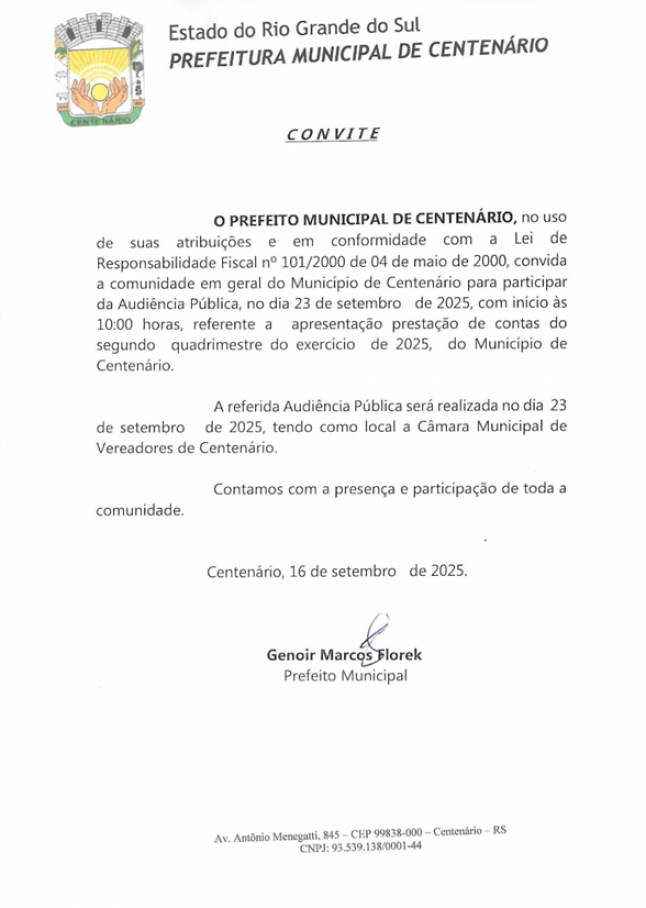A Administração Municipal de Centenário convida toda a comunidade para participar da Audiência Pública de Prestação de Contas do 2º quadrimestre de 2025, que será realizada no dia 23 de setembro, às 10h, na Câmara Municipal de Vereadores.